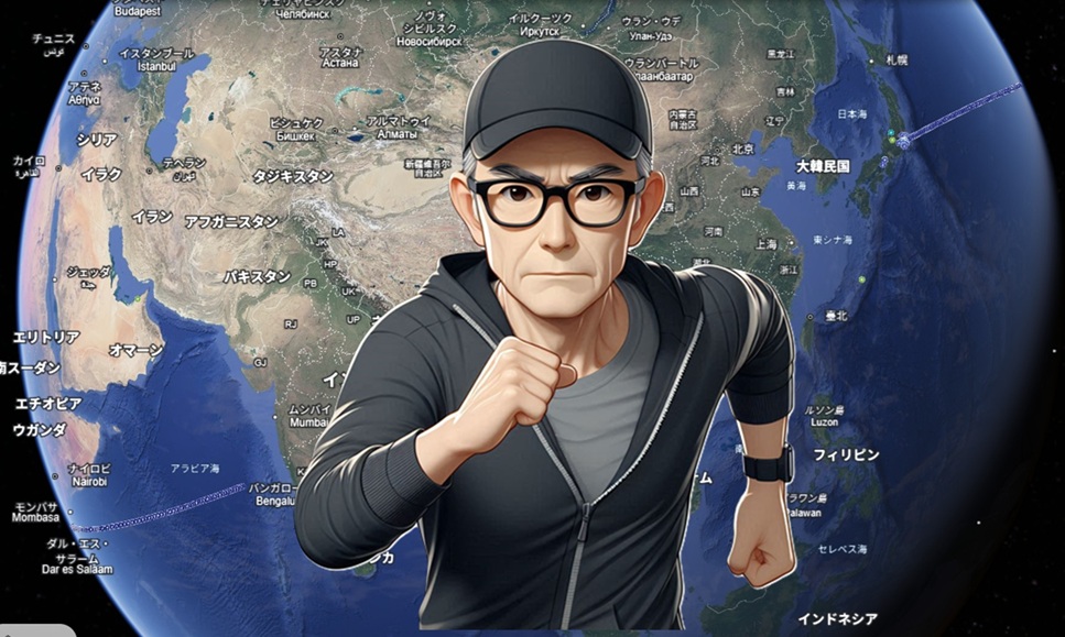 生涯で地球一周を走破するチャレンジをしています。東京駅を出発点に地球の裏側ブラジルのイグアスの滝付近を経由する地球一周コース上に、これまでのランニング走行距離をグーグルマップ上に積算して表示しています。