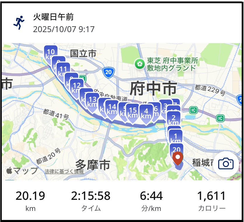 それで、そろそろ焦ってきて、先週あたりから涼しくなってきたので、外ラン中心のトレーニングにモードチェンジしました。15km程度を3度ほど、近所を走った後、本日久しぶりのホームコースの多摩川沿いへ。距離もやっと20kmを超えました。