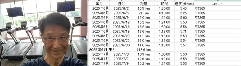 6月に入ってからはとても暑いので、冷房の効いたジム(近所のフィットネスジム FIT365 稲城SANWA)でランニングしています。