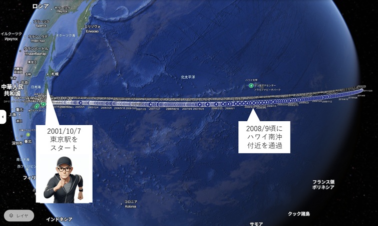 そうこうしているうちに、2008年9月頃は、地球一周コースの6,800km(1/6 周)あたりのハワイ・オアフ島の南沖を通過しました。
