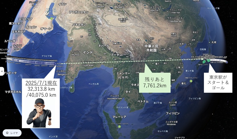 2025年7月現在では、アラビア海上でインドバンガロール沖までやってきました。32,313.8 km/40,075.0 kmと地球一周の約80%を走破しています。残りはあとたった7,761.2kmです。