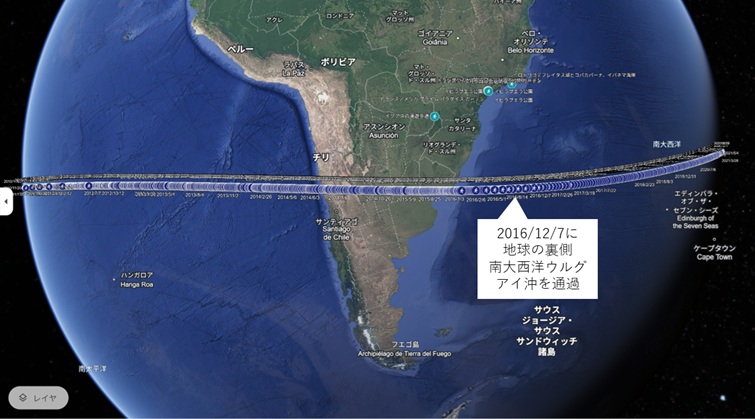 さらに、太平洋上(?)を延々と走り続け、南アメリカ大陸のチリ・サンジエゴ付近に上陸。ブラジル・イグアスの滝の近くを経てウルグアイ経由で南大西洋沖の地球の裏側地点に2016/12/7に到達しました。ここで、地球半周です。15年の歳月を要しました。