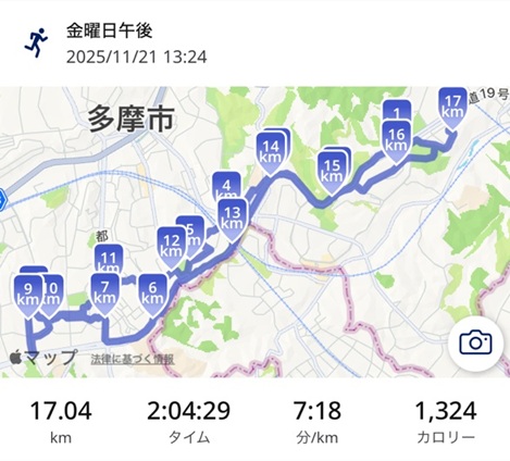 11/9のおかやまマラソン完走後、1週間の休息を経て、今週からゆっくりとランニングを再開。月、水とジムのトレッドミルで10km程度、軽く汗を流しました。そして、本日は、地元の多摩地域でまったりと紅葉狩りラン。ところどころ足を休めて写真撮影しながら、約17kmを2時間程度でゆっくりと走りました。
